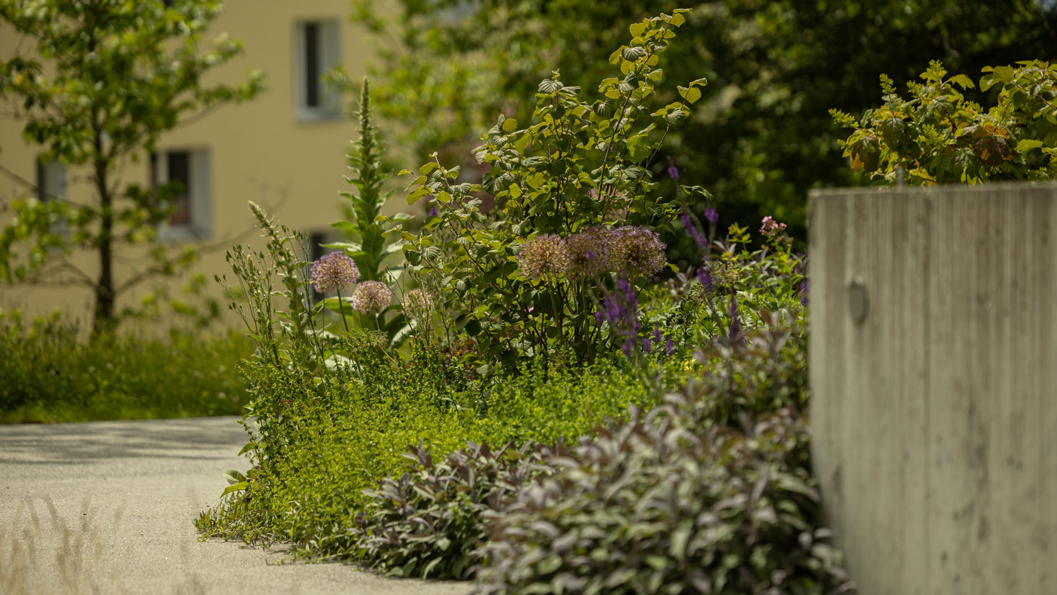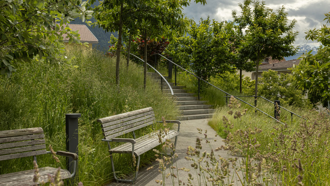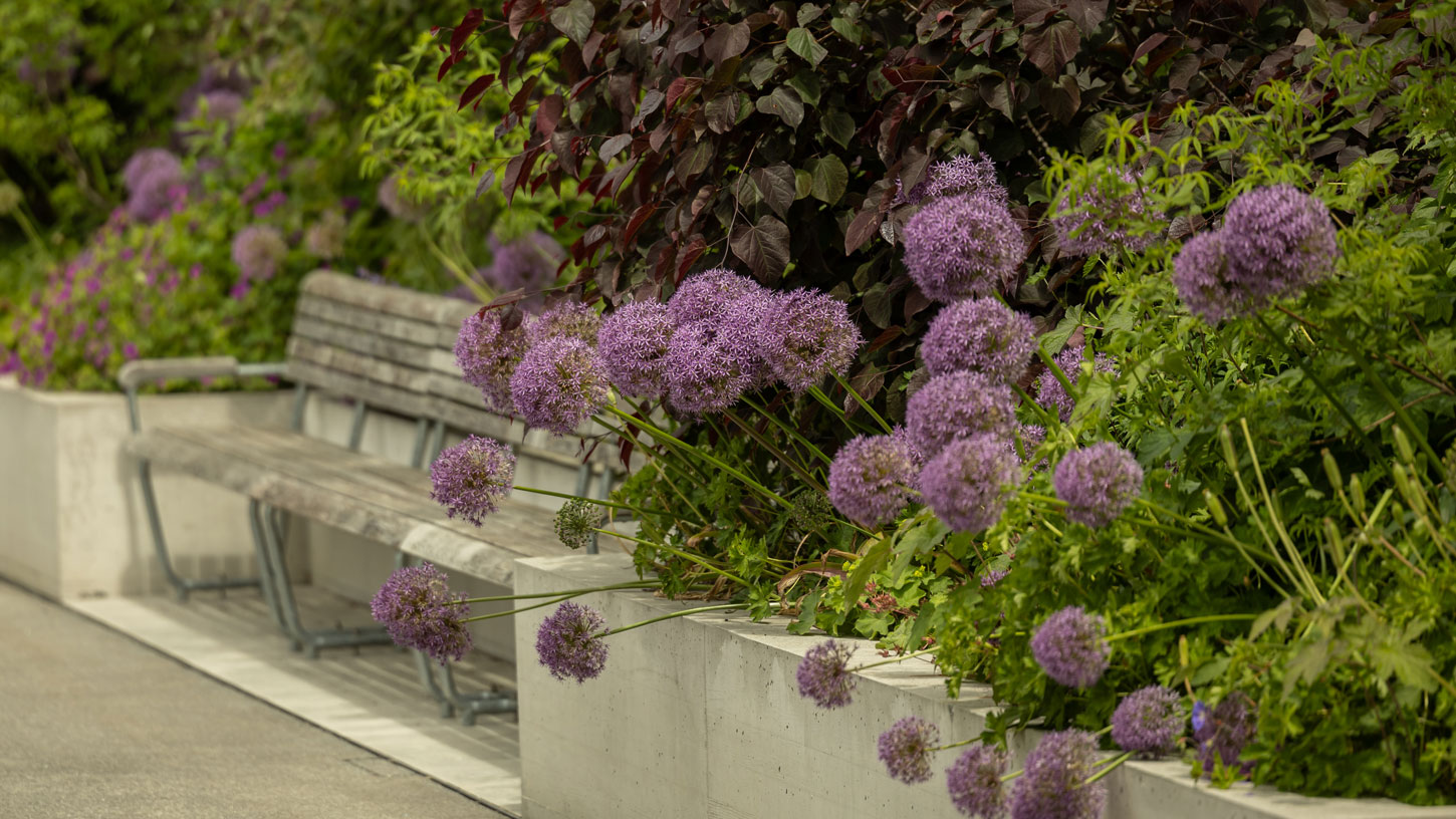 Die Bepflanzung kontrastiert die starken Mauern und fügt sich sanft um Nischen mit Sitzgelegenheiten. Dieses blumige Sujet der Gartengestaltung soll den Patienten zur schnelleren Genesung verhelfen und bildet für Besucher eine wahre Augenweide, die übers ganze Jahr über verschiedene Höhepunkte mit sich bringt.